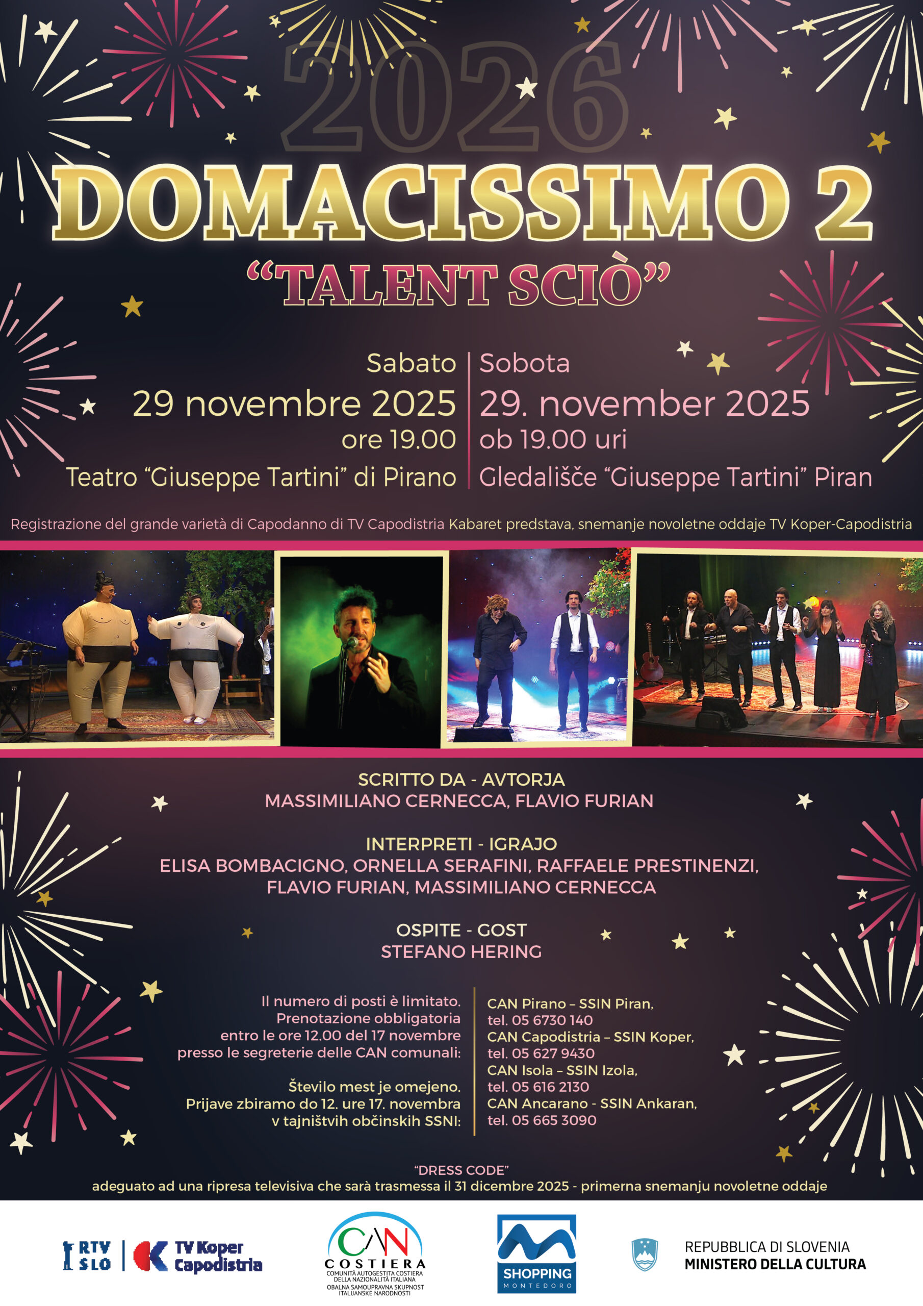 Il 29 novembre 2025, alle ore 19.00, presso il Teatro “Giuseppe Tartini” di Pirano, si terrà la seconda edizione dello spettacolo “Domacissimo”, ideato e realizzato dagli autori Massimiliano Cernecca e Flavio Furian.