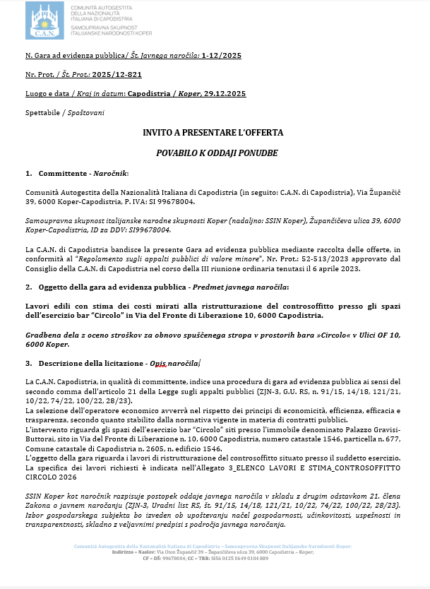 | Inizio gara ad evidenza pubblica – Začetek javnega naročila | 29.12.2025 | Documentazione di gara (29.12.2025 2026, Nr.Prot.: 2025/12-821) Razpisna dokumentacija (29.12.2025, Prot. Št. 2025/12-821) |